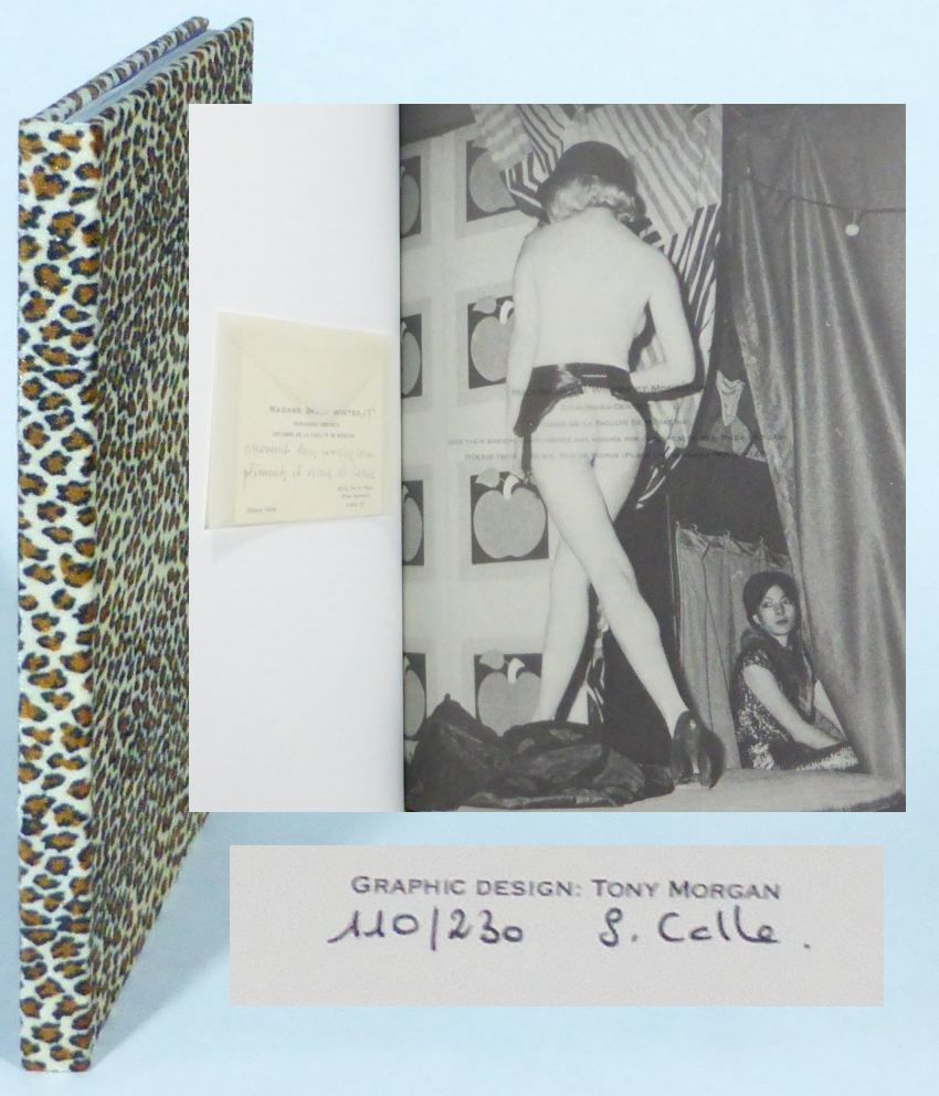 New York; Thea Westrich, 1991. 29x21 cm. 18 leaves + 16 photos printed on transparent vellum. Bound in imitation leopard skin and placed in the original card box, with printed paper-label on front panel. There are a few light creases on the box. The book is very fine. This is no. 110 of the edition's 230 copies and signed by Calle on the colophon. In The Doctor's Daughter, Calle plays the role of Sophie, the doctor's daughter who grows up to be a striptease artist. Opposite the photos are leaves with tipped-in envelopes with note cards, written in French and with an English translation on verso of the facing leaves. Calle treats issues of gender and sexuality ""with complexity and subtlety, though with an admirable economy of means"" (The Photobook). From the library of Anders Tornberg Gallery in Lund, Sweden, and with a stamp confirming this on inside of the box. The Open Book pp. 352-353. The Photobook, vol. II, pp.166-67.