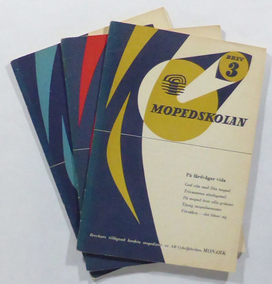 Stockholm, 1954. 21x15 cm. 31, (1) & 31, (1) & 31, (1) s. Illustrerade. Klammerhäftade med tryckta omslag. Lätt nötta ryggändar. Andra häftet med några hörnveck och ett riss i övre marginalen på två blad. En fin, komplett uppsättning med diverse lösa bilagor bevarade, t. ex. beställningsformulär, slutprov och karta över vägmärken. Original printed wrappers, stapled. Spine ends are slightly worn. The second leaflet has a few cornerfolds and a short tear in top margin on two leaves. A fine, complete set of three instruction leaflets for mopeds, published by Monark.
