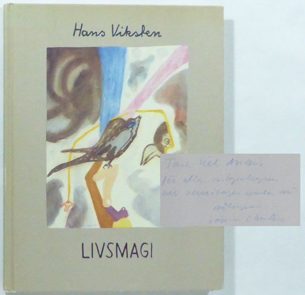 Stockholm; Atlantis, 1990. 29x22 cm. 106, (4, 2 blanks) pp. Publisher's printed boards. Spine ends are a trifle bumped. A fine copy. The book is based on the posthumous exhibition ""Livsmagi"" (The Magic of Life) of 1988, a display of Swedish artist Viksten's last watercolours, with his own poetic comments. The book is designed by Christer Jonson, who has inscribed the copy to gallery owner Anders Tornberg, thanking him for the sending of invitation cards through the years. From the library of Anders Tornberg Gallery in Lund, Sweden, and with a stamp confirming this on the last blank page.