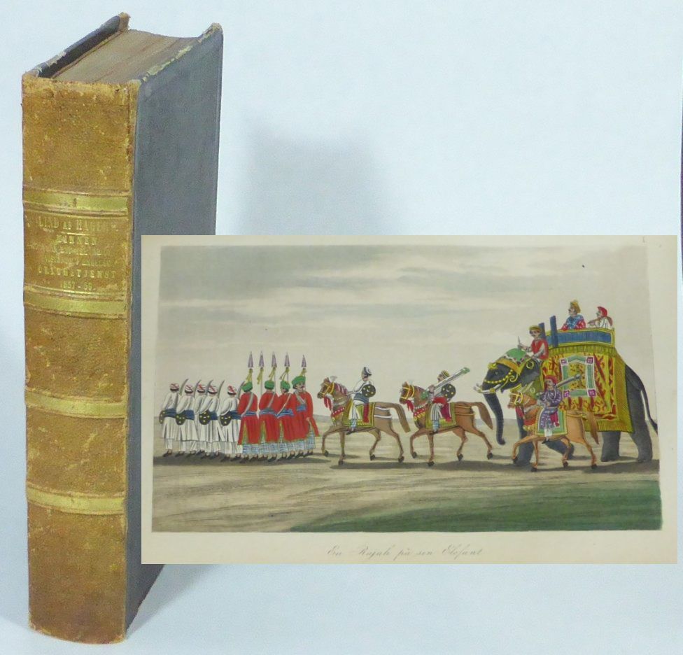 Stockholm; Adolf Bonnier, 1860. 8:o. 24,5x16 cm. (9, 1 blank), 214, (2), 215-468, (2) s. + 27 planscher och 4 utvikbara kartor. Samtida brunt halvfranskt band med förgylld ryggtitel och upphöjda bind, svarta pärmpapper och dekorerade försättsblad. Med ett monterat släktvapen på det första blanka bladet med ett lejon, en bevingad bygelhjälm samt tre röda blommor. Bandet något nött. Andra kartan med en reva i den inre marginalen. Inlagan med ett fåtal spridda småfläckar samt hörnveck. Fint ex. Författaren tjänstgjorde huvudsakligen i Indien och beskriver, förutom det rent militära, det indiska samhället och dess förhållande till England, samt iakttagna seder och bruk.