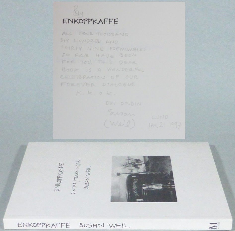 Lund; LeanderMalmsten, 1997. First edition. 28x21,5 cm. (133, 3 blanks) pp. Original printed wrappers. A fine copy. The book contains around 60 short poems, each one of them combined with a picture. With a preface by Anders Tornberg, owner of the Tornberg Art Gallery in Lund, to whom Weil during 12 years sent a daily picture-poem, a total of around 4500 picture-poems. These poems were created while the artist had her morning coffee, hence the title ""En kopp kaffe"" (A Cup of Coffee). With Tornberg's preface in English on a loosely inserted leaflet. Inscribed by Weil to Anders Tornberg on the half-title: ""&y / ENKOPPKAFFE / ALL FOR THOUSAND SIX HUNDRED AND THIRTY NINE POEMUMBLES SO FAR HAVE BEEN FOR YOU. THIS DEAR BOOK IS A WONDERFUL CELEBRATION OF OUR FOREVER DIALOGUE / K. K. O K. / DIN DINDIN / Susan (Weil) / Lund Jan. 21 1997"". From the library of Anders Tornberg Gallery in Lund, Sweden, and with a stamp confirming this on the last blank page.