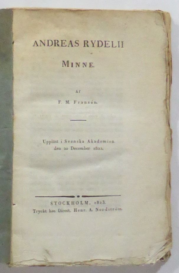 Stockholm; tryckt hos direct. Henr. A. Nordström, 1823. 8:o. 22x14,5 cm. (2), 94 s. Samtida blankt gråpappersomslag. Oskurna snitt, ouppskuren. Omslaget lätt solkat samt med en reva i övre framfals. Genomgående svagt fläckade marginaler. Fint ex. Franz Michael Franzéns minnestal över filosofen och biskopen Andreas Rydelius (1671-1738).