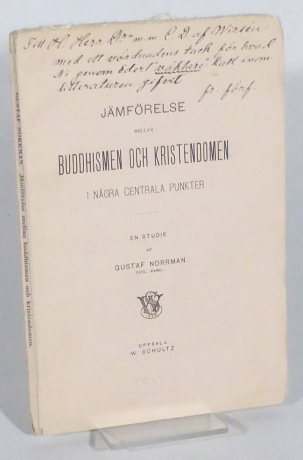 Uppsala; W. Schultz, 1902. 19,5x13 cm. 77, (2, 1 blank) s. Häftad med tryckt omslag. Något snedläst. En horisontell reva mitt på ryggen, nedlimmad reva invid rygghuvudet samt riss i båda nedre falsar. Åtta blad med lite ojämn övre resp. yttre marginal p. g. a. ovarsam uppskärning. En hel del blyertsmarkeringar i yttermargonalen, några korrekturrättningar samt en sida med en liten kommentar i blyerts. Bra ex. Norrman (1873-1936), teolog samt studierektor vid Fjellstedtska skolan i Uppsala. Hans jämförelse utfaller till kristendomens fördel. Dedikation till Svenska Akademiens dåvarande ständige sekreterare: ""Till H. Herr Dr. m. m. C. D. af Wirsén med ett vördnadens tack för hvad Ni genom Edert 'väktare'-kall inom litteraturen gifvit / fr. förf.""
