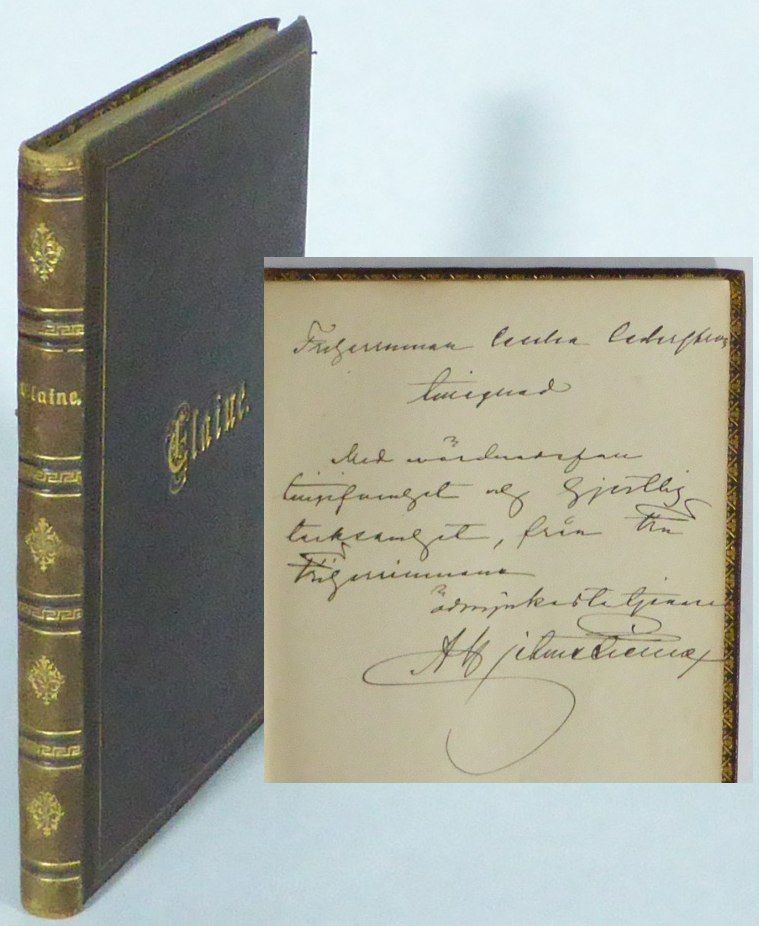 Stockholm; Z. Haeggströms Förlagsexpedition, 1877. Originalets titel: Elaine (ur Idylls of the King, 1859-1885). 20,5x14 cm. Titelplansch, (1, 1 blank), 158 s. Samtida brunt skinnband (Axel Engström, Stockholm) med förgylld ryggdekor, titeln i guldtryck på främre pärm, helt guldsnitt och inre denteller. Omslag ej medbundet. Ryggen aningen nött och pärmhörnen lätt tilltryckta. De flesta blad aningen fläckade och en nästan genomgående skrynkla i övre marginalen. Första svenska utgåvan av dikten som ingår i Tennysons svit om 12 dikter på Kung Arthur-temat. Dedikation från översättaren på första blanka bladet: ""Friherinnan Cecilia Cederström tillegnad / Med vördnadsfull tillgifvenhet och hjertlig tacksamhet, från en[?] Friherinnans ödmjukaste tjänare / Aug. Hjelmstierna"".