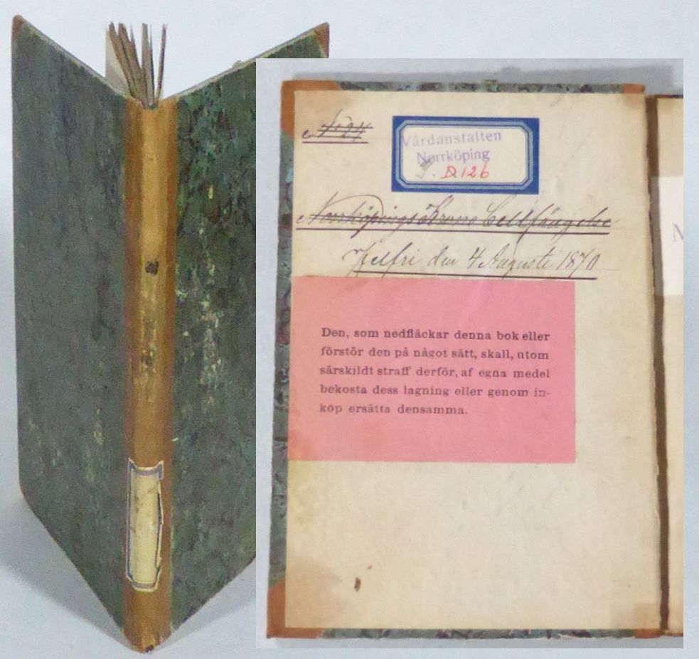 Stockholm; Ebeling & comp., 1856. Originalupplaga. 18x12,5 cm. (2, 2 blanka), 69, (1 blank) s. Ljusbrunt halvfranskt band med pappersetikett på ryggen och marmorerade pärmpapper. Omslag ej medbundet. Exlibris för Marianne & Fritz Serenander på främre försättsblad. Ryggen aningen nött samt med några fläckar där det ser ut att ha suttit änne en etikett. Inlagan med några spridda småfläckar. Främre innerpärm med delvis överstruken accessionsnotering för Norrköpings Krono-Cellfängelse, daterad 1870 och införd som nr 24, senare etikett för Vårdanstalten Norrköping, samt med en inklistrad lapp med texten: ""Den, som nedfläckar denna bok eller förstör den på något sätt, skall, utom serskildt straff derför, af egna medel bekosta dess lagning eller genom inköp ersätta densamma.""