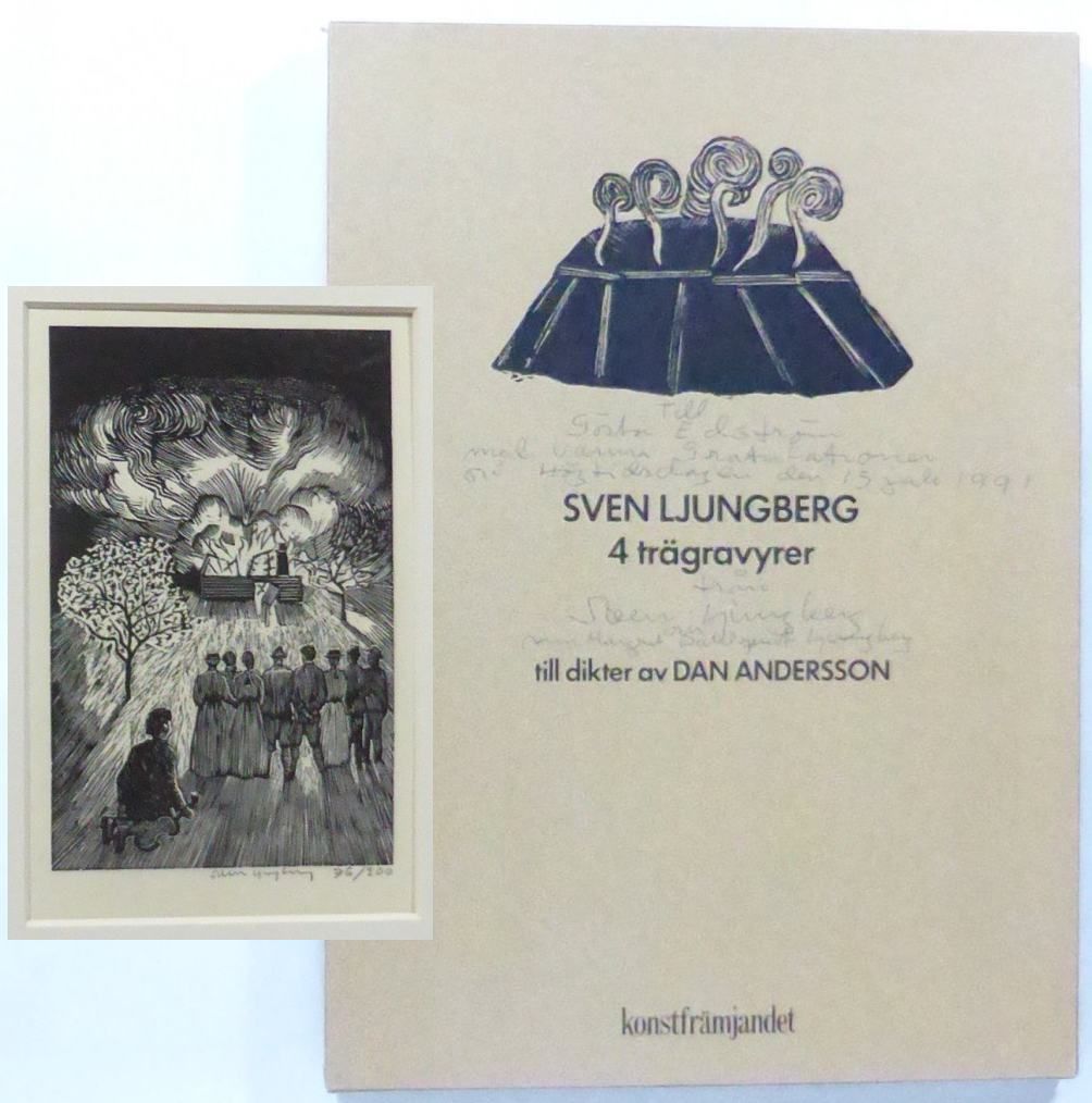 Stockholm; Konstfrämjandet, utan år [trol. 1991]. Fyra trägravyrer med bildyta 20x12,5 cm, signerade och numrerade 76/200 i blyerts, med passepartout. Med en text av Stig Sjödin om Ljungbergs illustrationer på ett löst bilagt blad. Förvarat i den tryckta originalkartongen. Utmärkt skick. Ljungberg har valt motiv från dikterna ""Branden"", ""En spelmans jordafärd"", någon av dikterna som skildrar arbetet vid kolmilan, samt ett havsmotiv från Anderssons översättning av Kiplings ""På sju hav"". Dedikation på kartongen från konstnären med fru till den kulturintresserade grundaren av Södra skogsägarna Gösta Edström (1901-2000): ""Till Gösta Edström med varma Gratulationer på Högtidsdagen den 15 juli 1991 från Sven Ljungberg och Ann Margret Dahlquist-Ljungberg"".