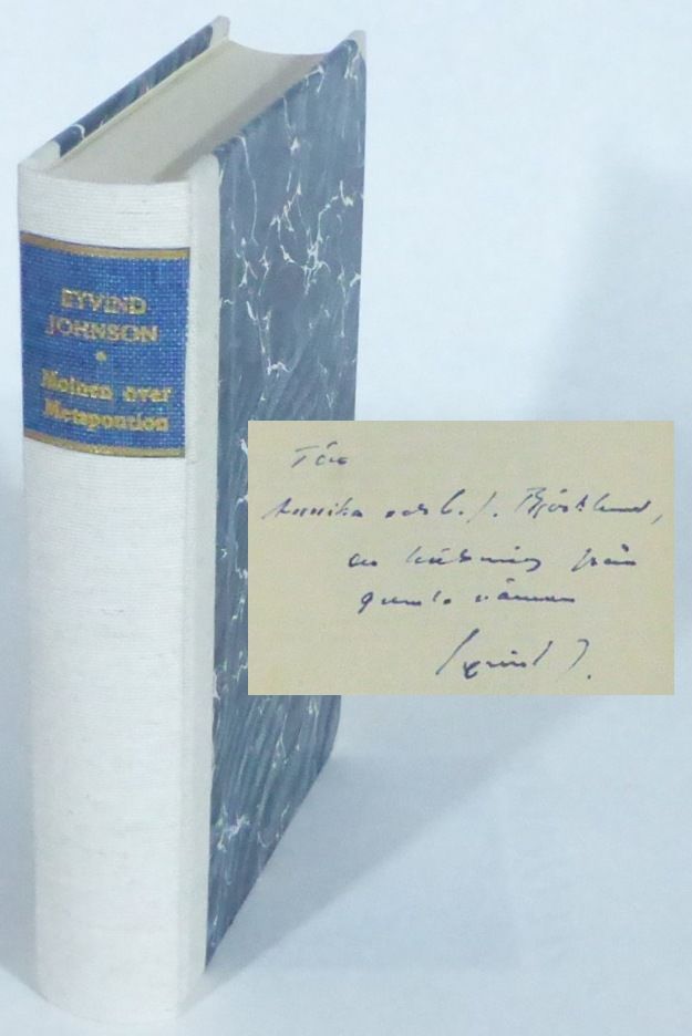 Stockholm; Bonniers, 1957. Originalupplagans sjätte-åttonde tusende. 19x13 cm. 403, (1) s. Senare grått halvlinneband med ryggetikett i blått klot, marmorerade pärmpapper. Omslaget medbundet. Omslagsvinjett av Roland Svensson. Ett par svaga pennstreck på främre omslaget. Fint ex. Dedikation: ""Till Annika och C. J. Björklund, en hälsning från gamle vännen Eyvind J."" Med C. J. Björklunds ägaretikett på främre omslagets verso. Annika Björklund var författare och kompositör, Carl Johan Björklund författare och redaktör för tidningen Brand, där Johnson började publicera sig 1919. Mattsson, Eyvind Johnson Bibliografi A42.