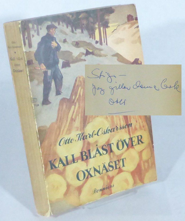 Stockholm; Bonniers, 1947. Originalupplaga. 20,5x14 cm. 363, (2, 1 blank) s. Häftad med tryckt omslag. Lätt snedläst. Ryggen med läsveck, svaga fuktringar samt reva i båda nedre falsar. Det överdimensionerade omslaget är aningen veckat i nedre marginalerna och vid hörnen. Recensionsstämpel på bakre omslag. Sista blanka bladet och bakre omslagets insida lite gulnade av ilagda tidningsurklipp (Helge Åkerhielms resp. Erik Golands recension av boken). Fin inlaga. Författarens tredje roman som innebar hans genombrott och renderade honom Svenska Dagbladets litteraturpris. Svenskt litteraturlexikon skriver: ""Denna berättelse om en skogshuggarfamilj i Norrbotten skildrar usla förhållanden, med lungsoten som ständig följeslagare, men som kontrast till det trista motivet står situationernas rikedom och en objektivitet, som trots bokens drag av utvecklingsroman låter hela tavlan framträda med ett myller av träffande detaljer. Det är artistisk realism av gott märke, något i släkt med Eyvind Johnsons i Olof-böckerna."" Dedikation till Stig Carlson: ""Stig - jag gillar denna bok / Otto"". Fin association mellan de båda arbetarförfattarna. Carlsson var verksam som recensent vid Motala Tidning samt Arbetet och gav arbetarlitteraturen stort utrymme.