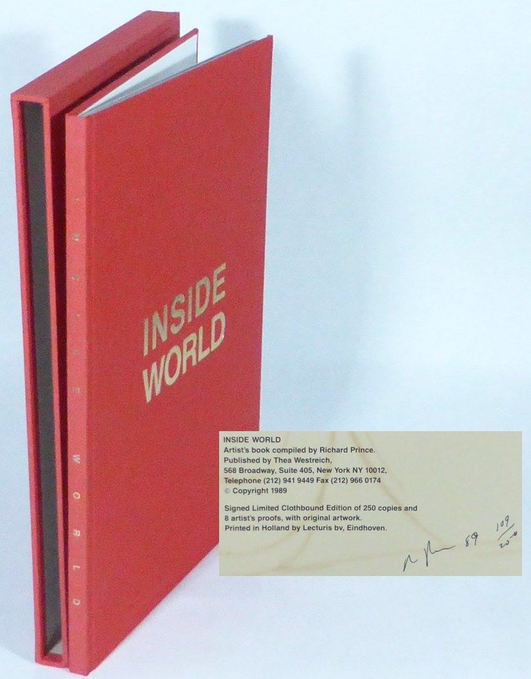New York; Thea Westreich, 1989. First edition. 31,5x22 cm. (88) pp. Original red cloth with gilt lettering on spine and boards, housed in the original cloth slipcase. Numbered and signed by Prince 109/250 on the justification page, and with the loosely inserted print with a ""joke"", signed by Prince in pencil. Very fine. Inside World was published on the occasion of the exhibition under the same name at Kent Gallery, New York, in 1989. The exhibition, co-curated by Richard Prince and Thea Westreich, is centered on American macho iconography. The book contains Prince's photographs of The Marlboro Man, stock car racing, heavy metal and biker culture etc., together with reproduced artworks by Francis Picabia, Sigmar Polke, Cindy Sherman, Richard Artschwager, Andy Warhol, and others, all of them treating different aspects of mass media culture. The deluxe edition was issued in 250 numbered and signed copies, and 8 artist's proofs. With each copy comes a different ""joke"", which in this case reads ""'If I refuse to go to bed with you', she wispered, 'will you really commit suicide?' That's been my usual procedure."" From the library of Anders Tornberg Gallery in Lund, Sweden, and with a stamp confirming this on the last blank page.