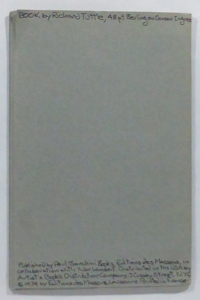 New York; Paul Bianchini Books & Lausanne; Éditions de Massons, in collaboration with Yvon Lambert, 1974. First edition. 25x16,5 cm. (26) pp. Original blank wrappers with title and colophon in handwriting by the artist on rear wrapper. Spine is slightly creased. A fine copy. The 26 printed pages, 48 pt. Berling on Canson Ingres, each represent a letter from the alphabet. Artist's book issued in an unknown number of copies. From the library of Anders Tornberg Gallery in Lund, Sweden, and with a stamp confirming this on the last blank page.