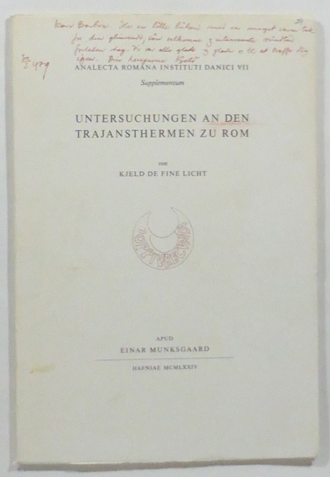 Copenhagen; Einar Munksgaard, 1974. (Analecta Romana instituti Danici VII. Supplementum). 29x20 cm. 48 pp. + 3 folding plates. Original printed wrappers. The oversized wrappers are slightly creased in lower margins, and insignificantly soiled. A fine copy. Inscribed by the author on front wrapper to Swedish archaeologist Barbro Sundnér.