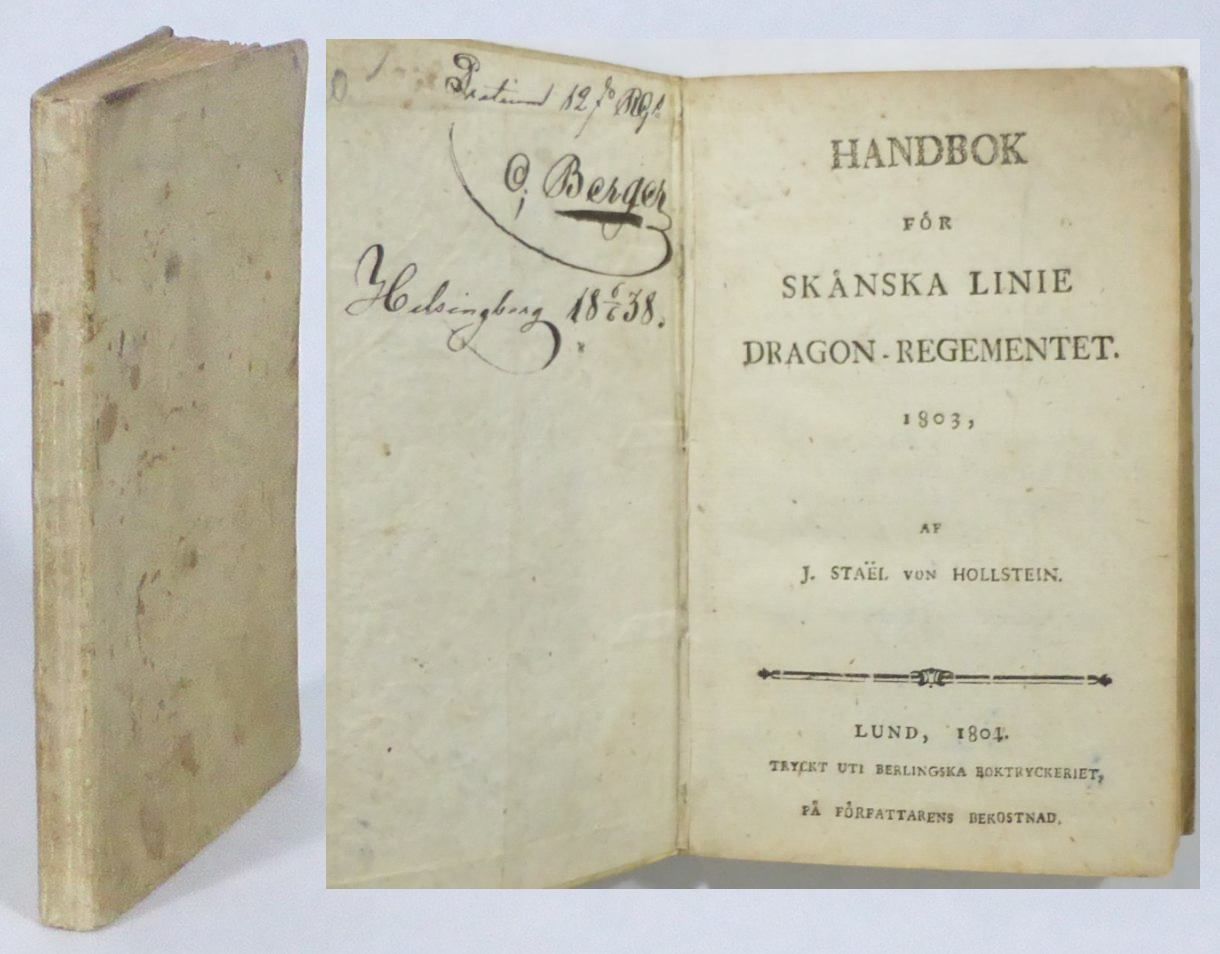 Lund; Berlingska Boktryckeriet, 1804. 8:o. 15,5x10 cm. 95, (1 blank) s. Illustrerad med 6 träsnitt i texten. Samtida pergamentband utan ryggtitel. Namnteckning på främre innerpärm (O. Berger, Helsingborg 1838). Bandet är något solkat och pärmhörnen lätt tilltryckta. En fläck på s. 17 och några förlorade bokstäver på motsvarade ställe på s. 16 där bladen vid något tillfälle häftat samman. Texten på två rader berörs men är fullt tydbar. Ett riss i nedre marginalen på s. 47/48. Inlagan med ett fåtal spridda småfläckar. Fint ex. Staël von Holstein (1758-1836), militär, medlem av Krigsvetenskapsakademien samt företagare, bl. a. drev han en period Klippans pappersbruk. Samma år som denna handbok för beridet infanteri gavs ut blev Staël von Holstein utnämnd till överstelöjtnant vid Skånska husarregementet och följande år gav han ut en något förkortad version för hela riket: ""Handbok för linie dragon-regementer"".