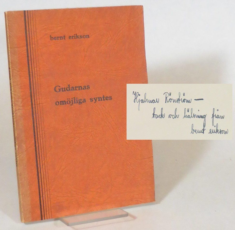 Stockholm; Bernt Erikson, 1948. Originalupplaga. 19,5x13,5 cm. 89, (1 blank) s. Häftad med tryckt omslag. Ryggen något blekt. Ett litet riss i främre omslagets yttermarginal. Bra ex. Tryckt i 200 exemplar. Dedikation: ""Hjalmar Rönström--tack och hälsning från bernt erikson"".