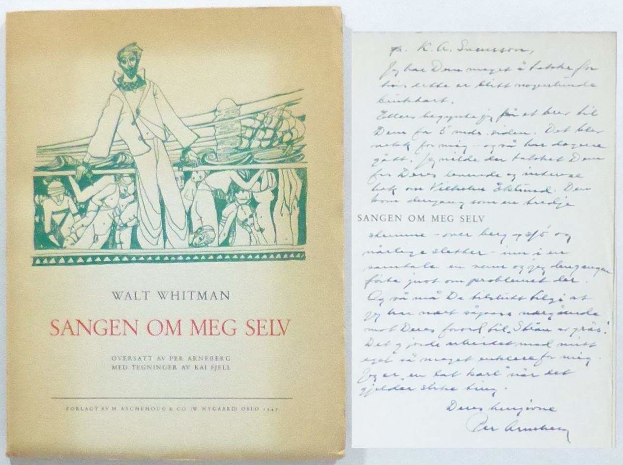 Oslo; H. Aschehoug & Co., 1947. Originalets titel: Song of Myself, ur Leaves of Grass (1855). 27x20,5 cm. 118, (3, 3 blanka) s. Häftad med tryckt omslag. Det överdimensionerade omslaget är något veckat i yttre och nedre marginalerna, samt med ett riss i främre omslagets nedre marginal. Rygg och omslagets marginaler är lätt mörknade. Några små mörka prickar överst på främre omslag. Fin inlaga. Med en lång versifierad dedikation från Arneberg till den svenske bibliotekarien och författaren K. A. Svensson. Arneberg tackar i dedikationen bl. a. för Svenssons översättning ur Whitmans ""Strån av gräs"" som utkommit 1935.