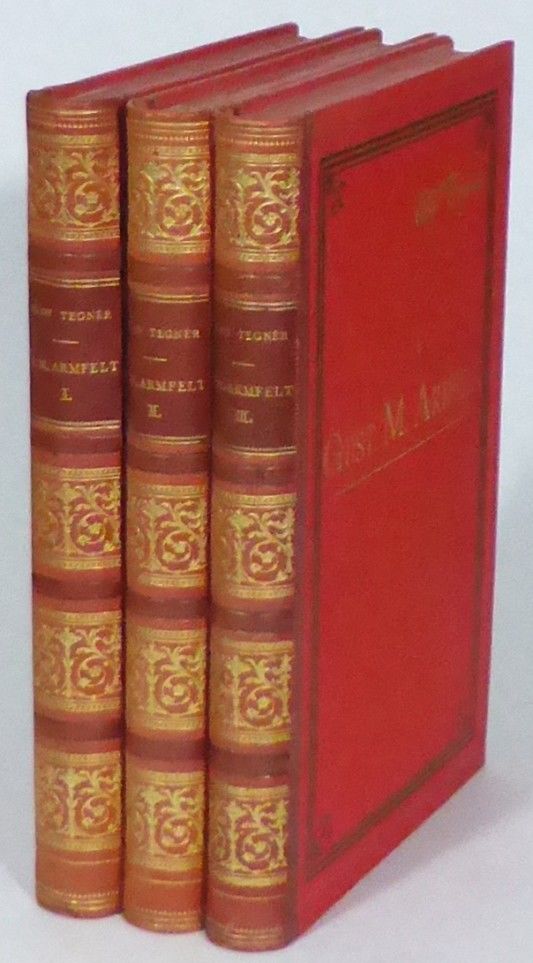 Stockholm; F. & G. Beijers förlag, 1893-94. (Från tredje Gustafs dagar. Anteckningar och minnen af E. Schröderheim, G. G. Adlerbeth och G. M. Armfelt. Ånyo utgifna af Elof Tegnér. III: Gustaf Mauritz Armfelt). 22x14,5 cm. Porträttplansch, (3, 1 blank), xi, (1 blank), 410 & (3, 1 blank), iv, 408 & (3, 1 blank), iv, 472 s. Förlagets dekorerade skinnryggband med klotöverdragna pärmar och röda snitt. Ryggarna obetydligt nötta samt med några små mörka prickar. Fin uppsättning.