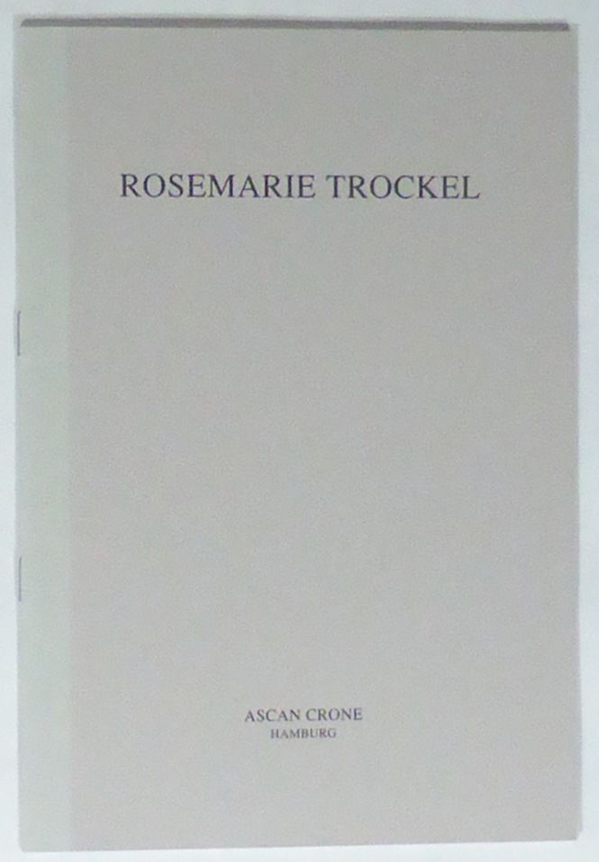 Hamburg; Ascan Crone, 1992. 24x16,5 cm. 16 pp. Illustrated. Original printed wrappers, stapled. Front wrapper is a bit faded in the inner margin. A fine copy of the exhibition catalogue. With Heymer's essay in both German and English. ""Rosemarie Trockel's knitted pictures are a wonderful polemic against the probing curiosity of psychiatry."" (pp. 9). From the library of Anders Tornberg Gallery in Lund, Sweden, and with a stamp confirming this on the last blank page.