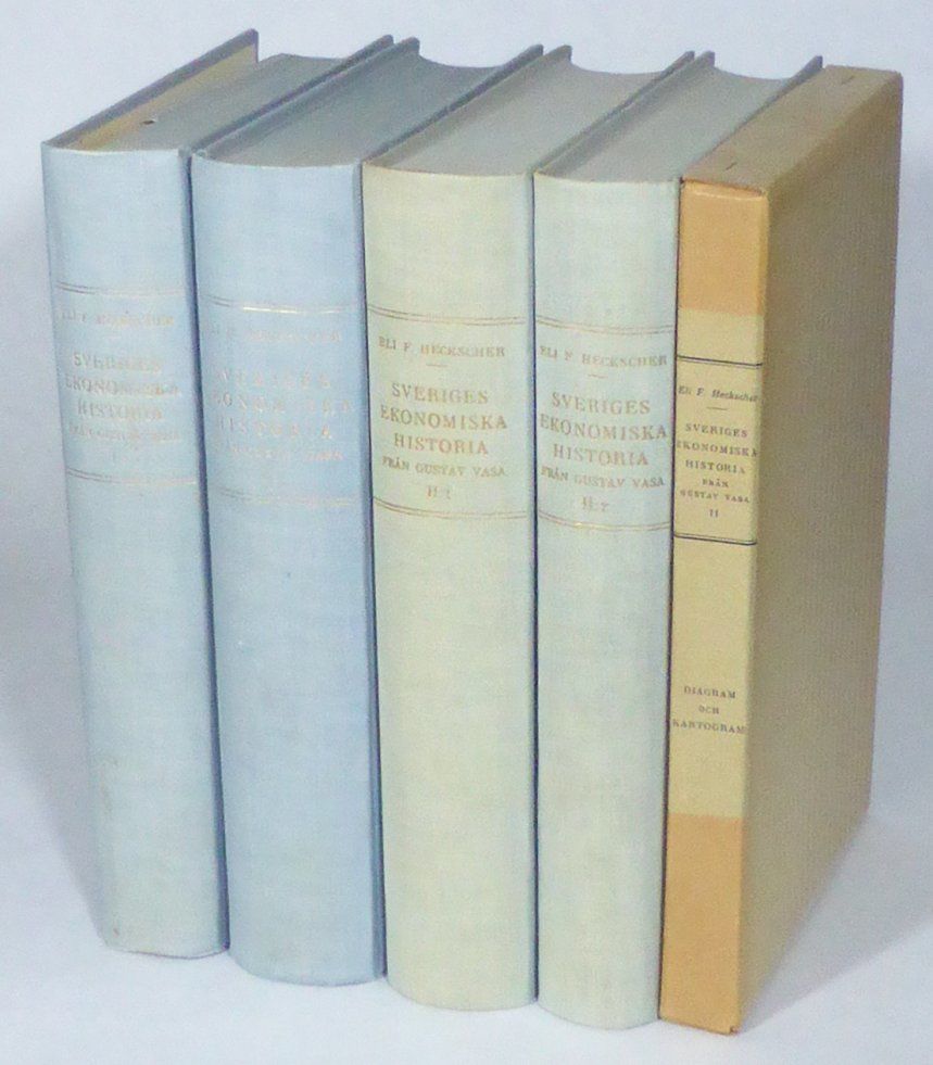 Stockholm; Bonniers, 1935-1949. 26x18 cm. Porträttplansch, 265, (1 blank) + xv, (1 blank), 33, (2, 1 blank) s. + kartor och diagram i pärmficka & porträttplansch, (4, 1 blank), 270-707, (1 blank) + xvii-xliii, (1 blank), 43, (1) & 584 & (4, 1 blank), 586-894 + lxii, 46 s. & 38 diagram och 11 kartogram i kassett. Fyra volymer i förlagets ljusblå, dekorerade klotband samt pappkassett med tryckt ryggtitel. Häftesomslagen medbundna. Aningen blekta ryggar. Några lätt stötta hörn samt några små stötmärken på pärmkanterna. Vol. I:1 med några svaga fläckar på ryggen. Fin, komplett uppsättning.