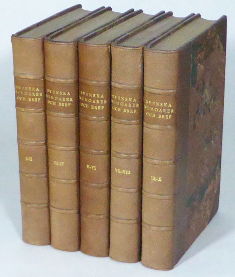 Stockholm; Bonniers, 1900-1906. 225x15 cm. (9, 1 blank), 238 & xv, (1 blank), 278 & xxix, (1), 250 & (3, 1 blank), 228 & viii, 240 & xxvii, (1 blank), 230 & xx, 226 & l, (1, 1 blank), 199, (1 blank) & (5, 1 blank), 280 & xiii, (1, blanka), 248 s. Fem osignerade bruna halvfranska band med förgyllda ryggtitlar, upphöjda bind, marmorerade pärmpapper och snitt. Omslag ej medbundna. Ryggarna aningen blekta och lätt nötta. En fin uppsättning. En ny serie påbörjades 1918 men endast en del utgavs i denna och saknas här. Innehåll: I. Öfverste Brelins anteckningar 1809-1818 / J. G. Oxenstiernas Mitt minne / Uno von Troils själfbiografi och reseanteckningar. II. Bibliotekarien C. C. Gjörwells familjebref. III. Fredenheims och Mennanders brefväxling, i urval utgifven af Henrik Schück. IV. Anekdoter till svenska historien under Gustaf III:s regering, af Adolf Ludvig Hamilton. V. Gustaf III:s resa i Italien. Anteckningar af Gudm. Göran Adlerbeth. VI. Bref från Elis Schröderheim. VII. Ur Geijers brefväxling. Familjebref af Erik Gustaf Geijer. VIII. Ur J. M. Sprengtportens papper. Minnesanteckningar. IX. Ur Nils von Rosensteins brefsamling. Bref från Rosenstein, Staël von Holstein, Leopold, Adlerbeth och Kellgren. X. Ur Clas Flemings papper. Bref från Fleming, Reuterholm, Fabian Wrede, Leopold och J. H. Schröder.