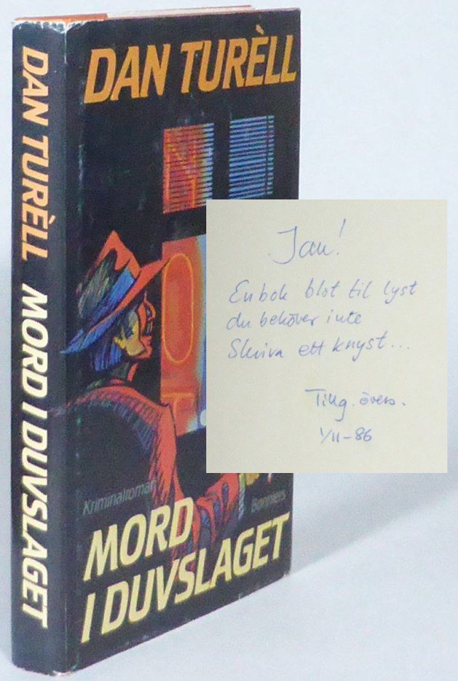 Stockholm; Bonniers, 1986. Originalets titel: Mord i Rodby (Köpenhamn, 1981). 22x14 cm. 249, (1) s. Förlagets pappband med tryckt skyddsomslag. Omslag av Peter Bundgaard. Skyddsomslaget lite naggat men ett fint ex. Första svenska utgåvan. Turéll gav ut tio egensinniga kriminalromaner, varav fyra översatts till svenska. Med en dedikation från översättaren till lundajournalisten Jan Mårtensson: ""Jan! / En bok blot til lyst / du behöver inte / Skriva ett knyst... / Tillg. övers. / 1/11 -86"".