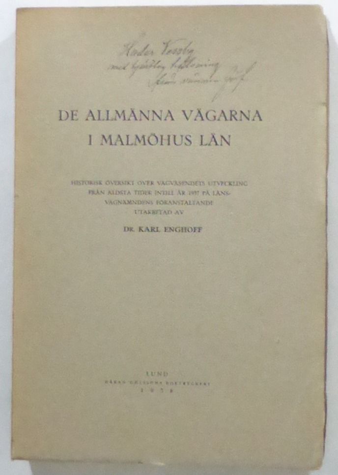 De allmänna vägarna i Malmöhus län. Historisk översikt över vägväsendets utveckling från äldsta tider intill år 1937, på länsvägsnämndens föranstaltande utarbetad av Dr. Karl Enghoff.