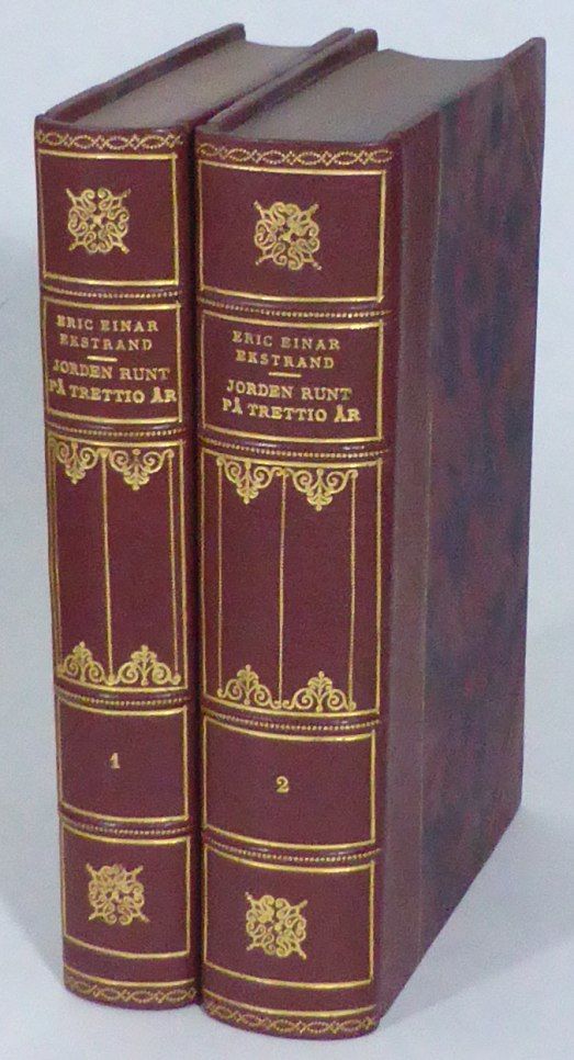 Stockholm; Norstedts, 1944. 22x15 cm. Porträttplansch, 339, (1) s. + karta & 467, (1) s. + 11 planschblad. Två osignerade samtida röda halvfranska band med förgylld ryggdekor och upphöjda bind, marmorerade pärmpapper och försättsblad samt infärgade snitt. Omslag samt ryggremsor medbundna. Mycket fint ex. Den svenske diplomaten Ekstrand (1880-1958) berättar här om sina många år som diplomat i bl. a. Ryssland, USA och Argentina.
