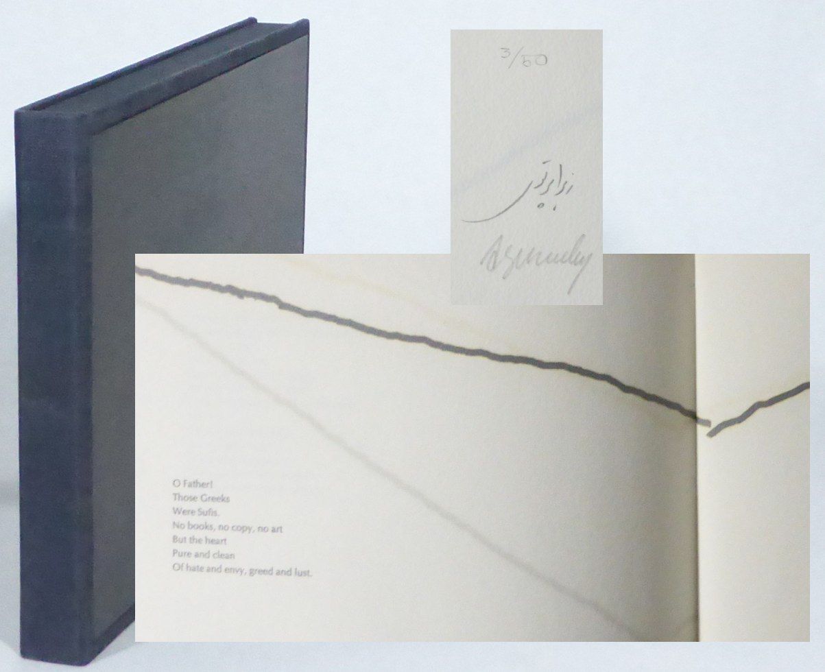 New York; Vincent FitzGerald & Co., 1989. 17x24 cm. (32) pp. + 2 blank leaves on maroon luxury paper. Bound in black silk by Zahra Partovi, and housed in a black silk clamshell box (David Bourbeau, Thistle Bindery) with steel plates inserted on the boards. Both the book and the box are shaped as trapezoids. Very fine. The text was printed by Allethaire Press and the Wild Carrot Letterpress, and the etchings by Marjorie Van Dyke and M'Lis Bartlett at The Printmaking Workshop on Rives Johannot and Dieu Donné paper. The etchings are printed as a continuous line throughout the book. The text, Rumi's parable on the Chinese painters versus the Greek painters, comes from the Mathnawi, translated and calligraphed by Partovi. No. 3 of 50 copies printed, signed by both the artist and translator on the colophon. From the library of Anders Tornberg Gallery in Lund, Sweden.