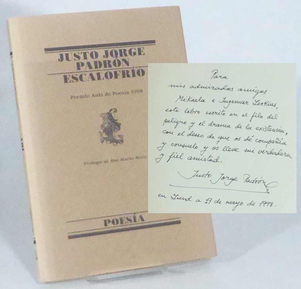Barcelona; Editorial Lumen, 1999. First edition. 21x15 cm. 91, (1, 2 blanks) pp. Original printed wrappers. Unopened. Spine and wrappers are partly faded. A fine copy. Inscribed by the author during one of his visits to Sweden: ""Para mis admirados amigos Mikaela e Ingemar Leckius, este libro escrito en el filo del peligro y el drama de la existencia, con el deseo de que os dé compañia y consuelo y os lleve mi verdadera y fiel amistad. / Justo Jorge Padrón / en Lund a 17 de mayo de 1998"". Padrón's main Swedish translator was Artur Lundkvist. Swedish authors Mikaela and Ingemar Leckius translated five poems by Padrón, which were published in the magazine Artes in 1988, and Padrón translated poems by Ingemar Leckius for various Spanish anthologies of Scandinavian verse.