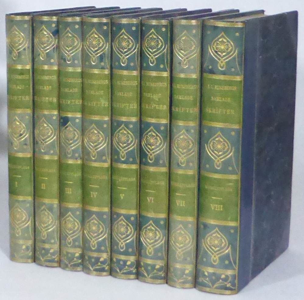 Helsingfors; Edlund, 1899-1902. 23x15 cm. Porträttplansch, (2, 2 blanka), v, (2, 3 blanka), 327, (1 blank) & (2, 2 blanka), iii, (1 blank), 338 & (3, 3 blanka), 271, (1 blank) & (2, 2 blanka), iii, (1 blank), 313, (1 blank) & (2, 2 blanka), ii, 311, (1 blank) & (2, 2 blanka), ii, 334 & (3, 3 blanka), 290 & (2, 2 blanka), iv, 473, (1 blank) s. Åtta volymer i stiliga blå halvfranska band (Hedberg) med förgylld ryggdekor och marmorerade pärmpapper. Omslag ej medbundna. Med Fritze's bokhandelsetikett på främre innerpärmar. Ryggarna blekta till grönt samt aningen flammiga. Ryggändar och pärmhörn obetydligt nötta. Enstaka understrykningar med rödkrita i vol. I, II och IV. Sjätte volymen med genomgående fuktrand i övre marginalen. Ett fåtal spridda småfläckar. Fin, komplett uppsättning. Med ett efterord, ""Runebergs skaldskap"", av redaktören Estlander.