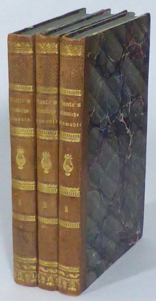 Leipzig; Brockhaus, 1832. 8:o. 21,5x13,5 cm. Engraved portrait plate, lxxii, 287 pp. + folding map of Inferno & (2, 2 blanks), 290 pp. + folding map of Purgatorio & (2, 2 blanks), 292, (1, 1 blank) pp. + folding map of Paradiso. Three volumes in contemporary brown half leather with gilt and blindstamped decorations on spine, marbled boards and green edges. With a small undeciphered owner stamp, probably with the initials E and S, on front paste-downs, and a numbering on front free endpapers (31, 32, and 33). Spines and corners are slightly worn. Contents are clean and bright, with just a few scattered small specks. The plate in the third volume is slightly spotted. A fine set.
