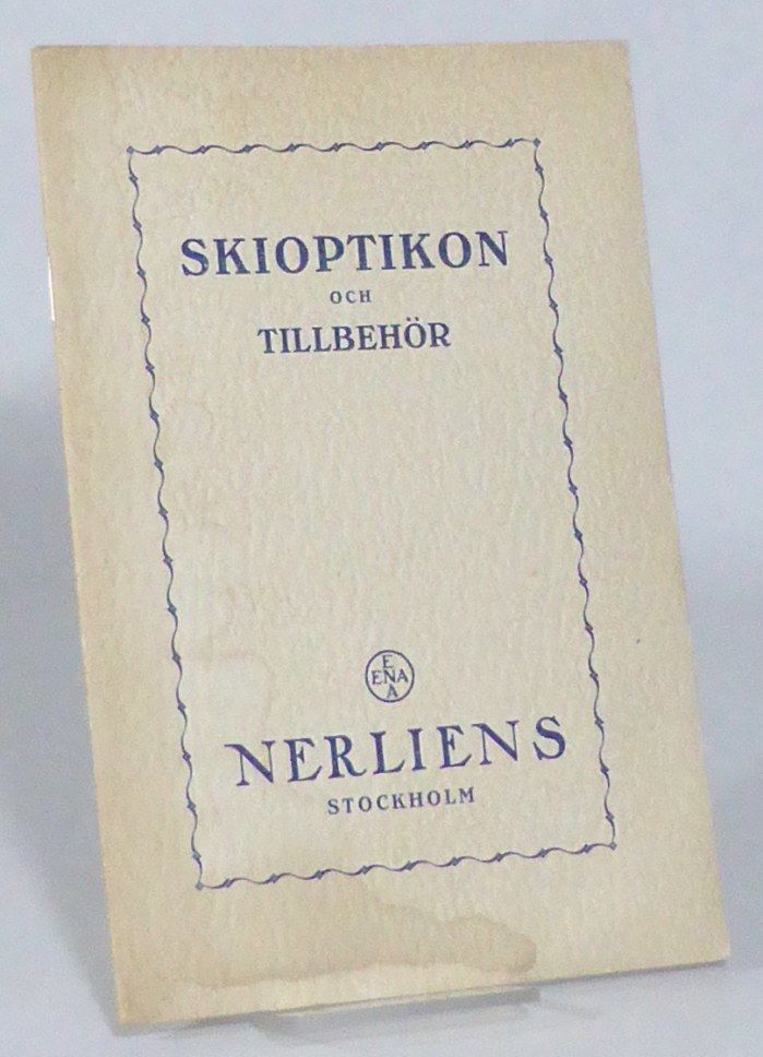 Stockholm; Nerliens, 1928. 22,5x15 cm. 44 s. Illustrerad. Klammerhäftad med tryckt omslag. Omslaget med svag fuktfläck invid ryggfoten som anas i form av lätta skrynklor på de flesta blad. Bakre omslaget fläckat. Bra ex. Produktkatalog över Nerliens utbud av Skioptikon med tillbehör, t. ex. lampor samt rörliga astronomiska bilder.