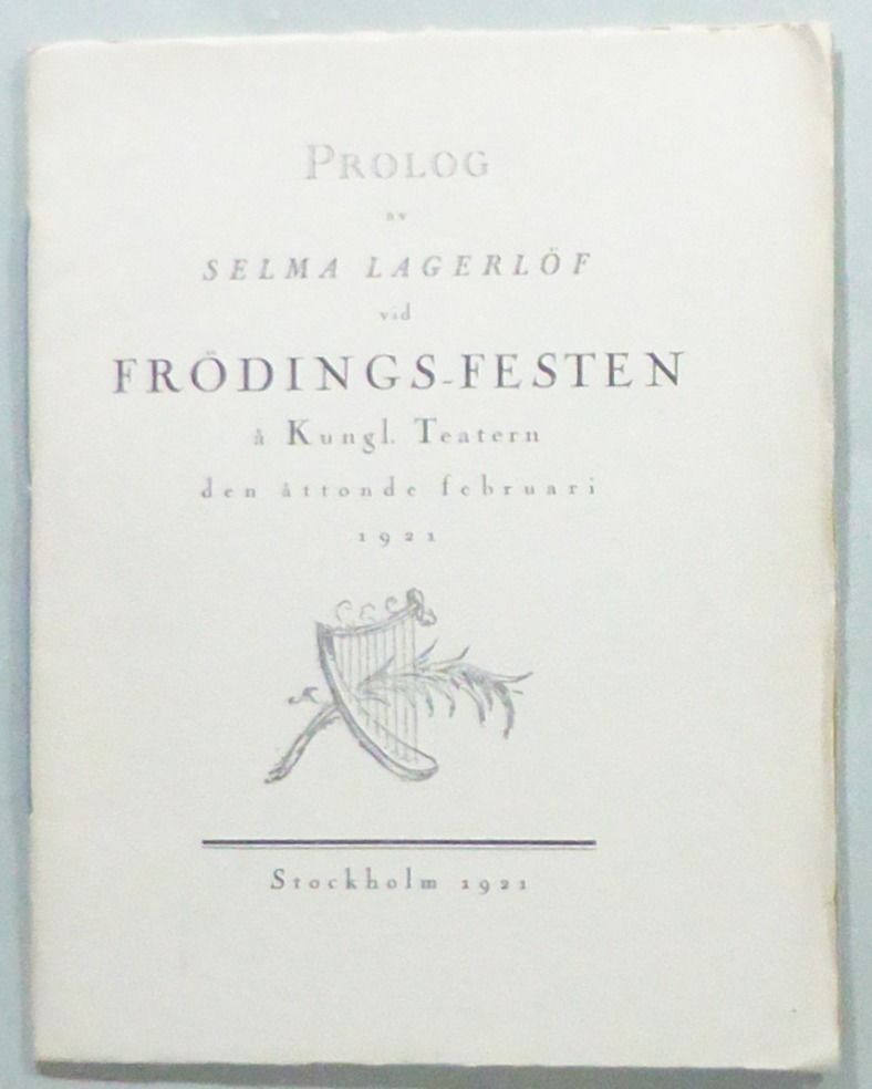Stockholm; Kungl. Boktryckeriet . P. A, Norstedts & Söner, 1921. 25,5x20,5 cm. Porträttplansch + 13, (1 blank) s. Häftad med tryckt omslag. Ett par små mörka prickar på främre omslag. Fint ex. En hyllning till Fröding på tioårsdagen av hans död som senare trycktes om i ""Troll och människor"". Prologen trycktes även som bibliofilupplaga i 100 numrerade exemplar. Afzelius, Selma Lagerlöfs bibliografi 288.