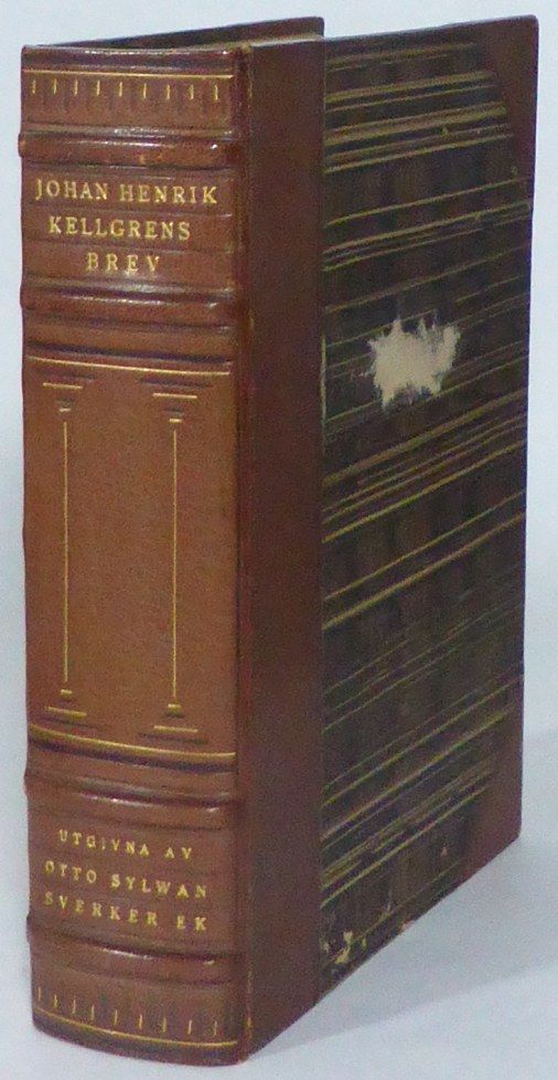 Stockholm; Bonniers, 1923. (Svenska författare utgivna av Svenska Vitterhetssamfundet IX). 25x18,5 cm. (1, 1 blank), xiii, (2, 1 blank), 363, (1 blank) & xv, (1 blank), 250 s. Gediget brunt halvmarokängband (Bonniers Bokbinderi) med ryggdekor i guld och svart, upphöjda bind, mönstrade pärmpapper och övre guldsnitt. Omslag ej medbundet. Obetydligt nött rygg. Pärmhörnen och främre pärmens papper lätt nötta. Fint ex. Med ett insatt tryckt dedikationsblad: ""Till Henrik Schück 2 november 1935 av utgivarne"", som förärats exemplaret på sin 80-årsdag som en hyllning till en tidigare utgivare av Kellgrens brev.