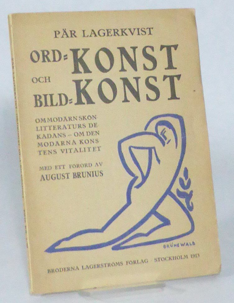 Stockholm; Bröderna Lagerströms Förlag, 1913. Originalupplaga. 21x15,5 cm. 61, (1, 2 blanka) s. Häftad med tryckt omslag. Omslagsteckning av Isaac Grünewald. Reva i övre bakre fals. Det överdimensionerade omslaget är lite veckat och aningen naggat i nedre marginalerna samt vid hörnen. Omslaget delvis mörknat samt med några små mörka prickar på främre panelen. S. 7/8 med ett riss i yttermarginalen, annars en fin inlaga. Lagerkvists tredje bok innehåller hans manifest för den nya litteraturen som bör inspireras av kubismen och ""isländsk litteratur, naturfolkens besvärjelse- och offersånger samt Österns gamla kulturfolks religionsurkunder"". En inspirationskälla var med all säkerhet Apollinaires ""Les peintres cubistes"" från samma år som Lagerkvist recenserade i Svenska Dagbladet. Willers, Pär Lagerkvist. En bibliografi 32.