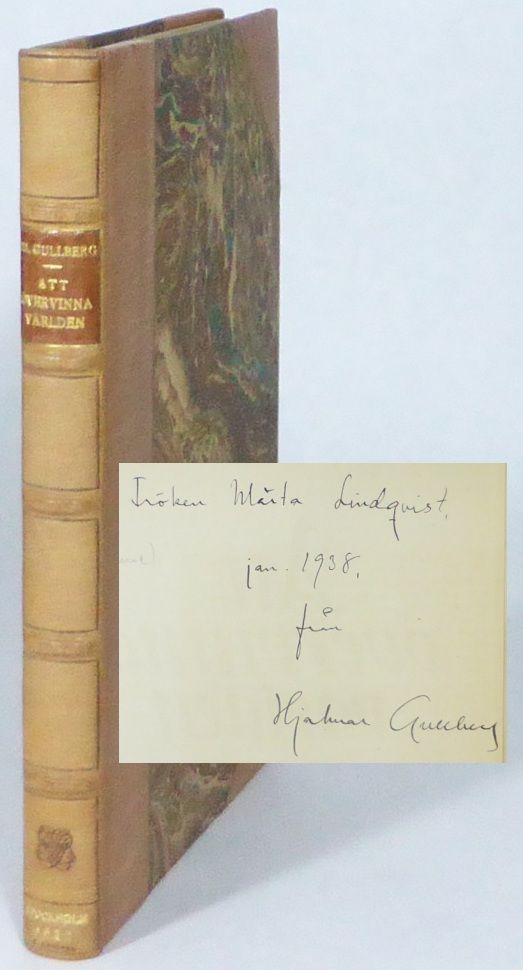 Stockholm; Norstedts, 1937. 24x16,5 cm. Samtida stiligt ljusbrunt halvfranskt band (Hedberg) med ryggetikett i rött skinn, upphöjda bind, marmorerade pärmpapper och försättsblad, övre guldsnitt och med övriga snitt oskurna. Med Gustaf Bernströms stämplade exlibris längst ned på ryggen. Aningen blekt rygg. En liten limfläck på främre omslagets verso. Med Erik Blombergs recension av boken inklistrad på några extrainsatta blanka blad i slutet av volymen. Mycket fint ex. I sin sjätte diktsamling återvänder Gullberg till den kristet färgade mystiken i ""Andliga övningar"" med dikter som ""Sjön"", ""Huvudskalleplats"" och ""Berceuse funèbre"". I Hagar Olssons recension heter det: ""Inför hotet av tidens politiska och andliga barbari har diktaren känt nödvändigheten av att väcka den enskilde, medan det ännu är tid, att vädja till evighetskärnan hos människan, den kärna av ljus som ensam förmår stå emot mörkrets anlopp. Djupt ner i samhällets katakomber, oåtkomliga för förföljaren, slutna kring sin kärna, skall evighetsmänniskorna bilda 'den hemliga framtidsarmén'."" Dedikation: ""Fröken Märta Lindqvist, jan. 1938, från Hjalmar Gullberg"". Lindqvist (1888-1939), journalist, översättare och under 20-talet en av landets första filmrecensenter. Hon recenserade Gullbergs översättning av Aristophanes' ""Fåglarna"" 1928 och publicerade 1938 en ett längre porträtt av honom i Svenska Dagladet, samma år omtryckt i hennes bok ""Människor"". Karlström, Hjalmar Gullberg. En bibliografi 3705.