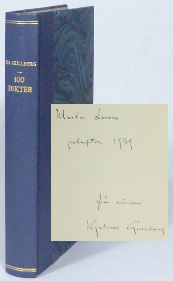 Stockholm; Norstedts, 1939. 22x14 cm. 188 s. Osignerat samtida blått halvklotband med förgylld ryggtitel och marmorerade pärmpapper. Främre omslaget medbundet. Rygghuvudet obetydligt nött. Några små fläckar på främre omslaget. Fint ex. Den första samlade utgåvan av Gullbergs dikter befäste hans position som en av landets ledande lyriker. Dedikation: ""Martin Lamm / julafton 1939 / från vännen Hjalmar Gullberg"". Med Lamms exlibris. Lamm (1880-1950), professor i litteraturhistoria, medlem av Svenska Akademien där Gullberg blev invald 1940. De båda var ledamöter av Samfundet De Nio. Karlström, Hjalmar Gullberg. En bibliografi 3907.