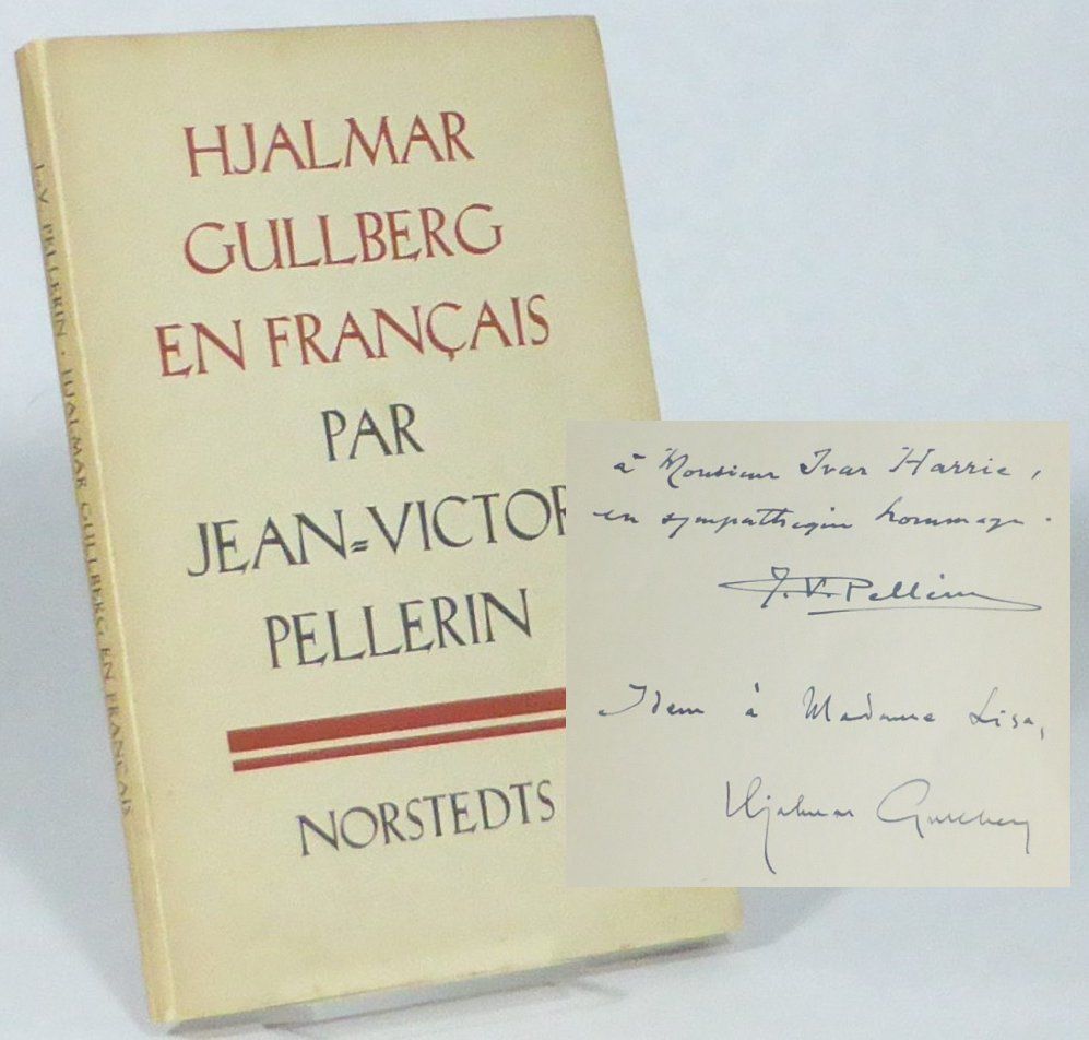 Stockholm; Norstedts, 1941. 20x13 cm. 108 s. Häftad med tryckt omslag. Omslaget aningen solkat. Reva i övre bakre fals samt i övre marginalen på sista bladet. Bra exemplar av den första översättningsvolymen på franska av Gullbergs verk, som innehåller dikter ur de sex dittills publicerade diktsamlingarna samt tre nyskrivna dikter: ""En sommar av nåd"", ""Noak"" och ""Tro"", vilka senare ingick i ""Fem kornbröd och två fiskar"" (1942). Med dedikation från både Pellerin och Gullberg: ""à Monsieur Ivar Harrie, en sympathetic hommage. / J. V. Pellerin"" & ""Idem à Madame Lisa, Hjalmar Gullberg"". Ivar Harrie (1899-1973), tidningsman och översättare, nära vän till Gullberg sedan studieåren i Lund och de båda genomförde ett antal översättningar tillsammans, t. ex. av Aristofanes och Calderón. Karlström, Hjalmar Gullberg. En bibliografi s. 227.
