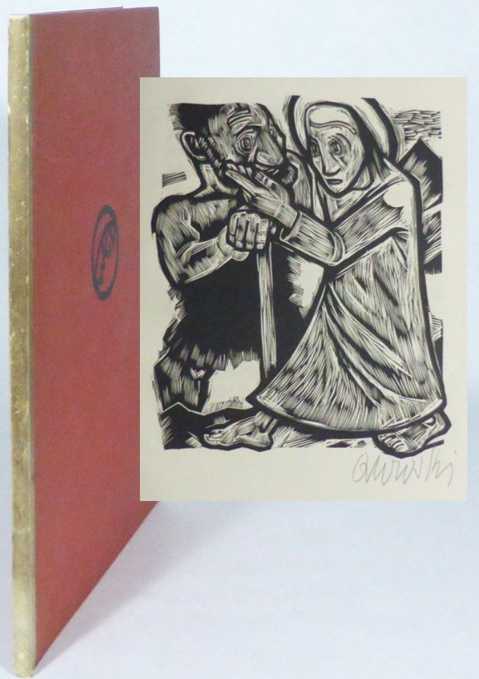 [Berlin]; Wendelkreis Verlag, 1924. 32,5x25,5 cm. (14, 2 blanks) pp. With four full-page woodcuts by Hans Orlowski, printed at the Kunstgewerbeschule in Charlottenburg and all of them signed in pencil by the artist. Publisher's vellum-backed boards with the publisher's device printed on front panel, gilt top edge. Spine is slightly worn and darkened. There are a few small specks on the boards. A fine copy. The text, a Georgian epic on the mythical, Prometheus-like hero Amiran (or Amirani), was translated by Adolf Dirr and originally published in his ""Kaukasische Märchen"" (Jena, 1920). Orlowski (1894-1967), German painter and woodcut artist. Orlowski attended the Kunstgewerbeschule in Berlin-Charlottenburg from 1911 to 1915. After the First World War he returned to Berlin and continued his studies at the Staatlichen Kunstschule under Philipp Franck. In 1920 he exhibited in the ""Freien Sezession Berlin"" and, by invitation, with the Belgian group ""Lumière"" in Antwerp. In the following years he also exhibited with this group, which included Jan and Jozef Cantré, André Lhote, Conrad Felixmüller, Frans Masereel, Joris Minne, Max Pechstein and Karl Schmidt-Rottluff. From 1921 to 1945 he worked as a teacher at the Kunstgewerbeschule in Charlottenburg. During this period he created numerous woodcuts and series of illustrations. In 1924 the artist turned away from Expressionism and destroyed almost all of his early work. The book offered was issued in an edition of 50 numbered copies, and in further 10 copies intended as gifts for friends of the publisher (""Frühlingsgabe für die Freunde des Wendelkreis Verlages...""). This is one of the 10 copies.