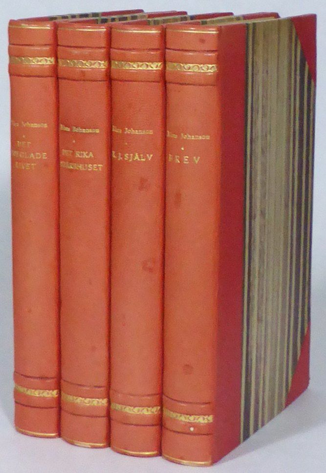 Stockholm; W&W, 1947-1953. 22x14,5 cm. 240, (1, 1 blank) & 240, (1, 1 blank) & porträttplansch, 277, (3) & porträttplansch, 279, (1) s. Fyra osignerade röda halvfranska band med förgylld ryggdekor, upphöjda bind, mönstrade pärmpapper och övre guldsnitt. Samtliga omslag samt ryggremsor medbundna. Exlibris för Lars R. Ljunggren resp. Anders Berglund i samtliga volymer, samt med den förres ägarstämpel på halvtitelbladen. Ryggarna aningen blekta och lite flammiga. Fina ex.