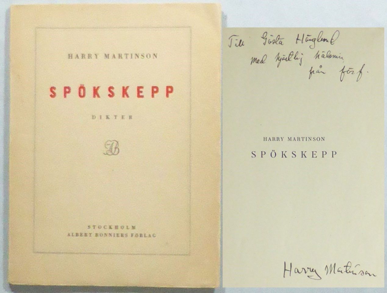 Stockholm; Bonniers, 1929. Originalupplaga. 22x16,5 cm. 71, (3) s. Häftad med tryckt omslag. Ryggfoten aningen nött samt med kort reva i nedre bakre fals. Svag fuktrand på rygg samt i omslagets inre marginal. Främre omslag med några små mörka prickar. Genomgående svag fuktrand i övre samt yttre marginalen. Bra exemplar av debutboken som gavs ut i en upplaga om 1500 exemplar. Dedikation: ""Till Gösta Höglund med hjärtlig hälsning från förf."" och med författarens signatur längre ned. Gösta Höglund (1914-1979), författare och illustratör som själv debuterade med en barnbok 1937, följd av en diktsamling 1938. von Sydow, Harry Martinsons bibliografi 1:1.
