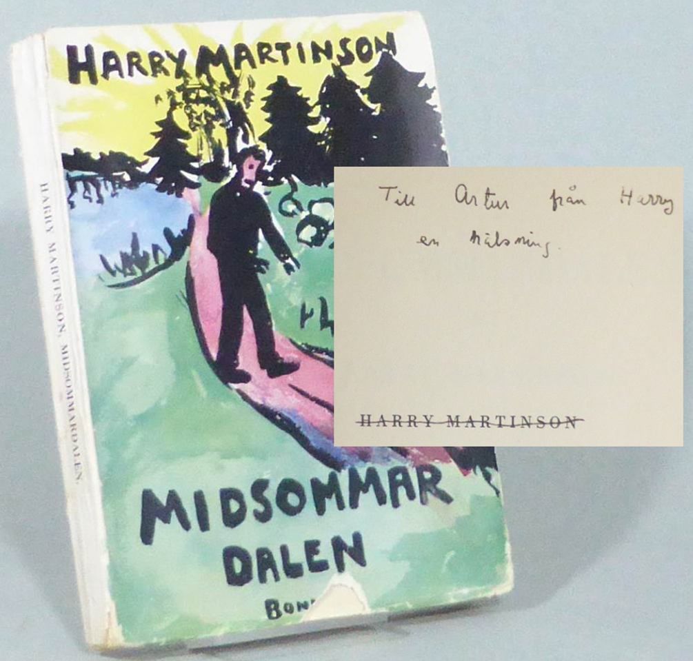 Stockholm; Bonniers, 1938. Originalupplaga. 20,5x14 cm. 142 s. Häftad med tryckt omslag. Omslag av Bror Hjort. Lätt snedläst och ryggen skrynklad samt med ett par små förluster. Förlust nedtill på främre omslag som drabbar förlagsnamnet. Bakre omslag samt sista blanka bladet med Y-formad reva (3x1 cm) mitt på sidan. Svag fläck på titelbladet. Den andra av Martinsons tre böcker med naturessäer, föregången av ""Svärmare och harkrank"" (1937) och följd av ""Det enkla och det svåra"" (1939). Dedikation på halvtitelbladet med det tryckta författarnamnet överstruket: ""Till Artur från Harry / en hälsning"". Mottagare var författaren Artur Lundkvist (1906-1991) som Martinson lärt känna 1927, ett möte som Kjell Espmark beskriver i ""Harry Martinson erövrar sitt språk"" (1970): ""Lokalen var Folkets Hus i Stockholm, där Lundkvist försökte sälja ett stycke till tidningen Den Arbetslöse, när en ung man kom fram till honom och frågade: ""Är du skald?"". Den andre som 'såg kvalificerat arbetslös ut', drog fram en tidning, uppvikt kring en dikt, och fortsatte: ""Är det du som har skrivit det här?"" Lundkvist erkände författarskapet och dikten fick, tillägger han vid samtal, betyget ""djävligt bra"". Så presenterade främlingen sig som Harry Martinson: ""Jag försöker också dikta lite. Vill du titta på en sak?"" De båda blev snabbt vänner, översatte på Lundkvists förslag Carl Sandburg tillsammans och utgjorde två av de fem unga 1929, senare i livet var de kolleger i Svenska Akademien där Martinson blev invald 1949 och Lundkvist 1968. von Sydow, Harry Martinsons bibliografi 1:10.