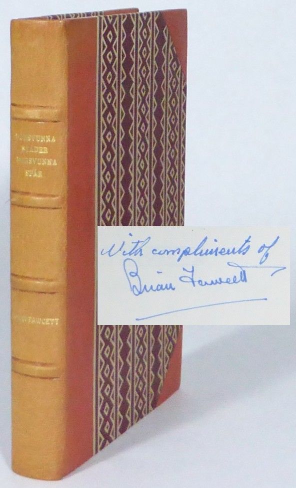 Stockholm; Forum, 1953. Originalets titel: Exploration Fawcett (London, 1953). Översättning av Pelle Fritz-Crone och Olle Moberg. 22x15 cm. 331, (1 blank) s. + planscher. Osignerat samtida rött halvfranskt band med förgylld ryggtitel, upphöjda bind och mönstrade pärmpapper. Omslaget medbundet. Ryggen något blekt. S. 125-206 med ett litet hörnveck upptill. Fint ex. Första svenska utgåvan. Behandlar Percy Fawcett (1867-1925). Signerad av författaren på halvtitelbladet: ""With compliments of Brian Fawcett"".