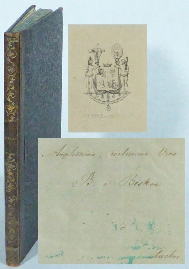 Copenhagen; Andreas Seidelin, 1828. 8:o. 21x13 cm. (1, 1 blank), 126 + 3, (1 blank) pp. Contemporary brown half leather with gilt decorations on spine, black patterned paper on boards, and marbled edges. Spine ends and corners are slightly worn. The title leaf has a vertical crease and a few insignificant specks. The last leaf has a mended tear in lower margin. A fine copy. The doctoral dissertation of Levin Abrahams, in which he treats the medieval ""Roman de Brut"" by Robert Wace. Pp. 73-121 contains an excerpt in the original French with a facing Danish translation. Abrahams (1798-1870), Danish scholar, appointed Professor of French at the University of Copenhagen in 1832. The book is inscribed by the author to Swedish author and member of the Swedish Academy Bernhard von Beskow: ""Amplissimo, doctissimo Viro B. v. Beskow / Auctor"". With the recipient's bookplate.