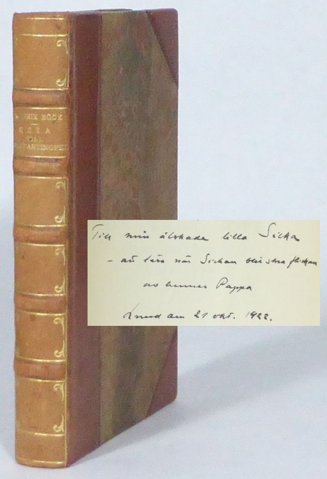 Stockholm; Norstedts, 1922. Originalupplaga. 19,5x13 cm. 350 s. Samtida rödbrunt halvfranskt band (C. J. Påhlmans bokbinderi, C. D. Carlsson) med förgylld ryggdekor, upphöjda bind, marmorerade pärmpapper och försättsblad, övre guldsnitt. Omslaget medbundet. Ryggen något blekt och lite flammig. Främre pärmhörnen aningen nötta. Titelbladet och det följande bladet med en lagning i övre marginalen. Bra exemplar av reseskildringen från Versaillesfredens Europa som löpande publicerades i Svenska Dagbladet. Svante Nordin skriver: ""Resa till Konstantinopel visade Böök på höjden av hans talang som reseskildrare. Boken innehöll både gemyt och romantik, både konkreta sinnesintryck och skarpsynta analyser. Dess konklusioner och förutsägelser skulle komma att visa sig ha varit väl grundade."" (Fredrik Böök. En levnadsteckning s. 246). Dedikation: ""Till min älskade lilla Sicka - att läsa när Sickan blir stora flickan av hennes Pappa / Lund den 21 okt. 1922."" Mottagare var Gun Böök-Hederström (1917-2019), dotter till Fredrik Böök. Arvidsson, Fredrik Bööks bibliografi 1898-1967, 1049.