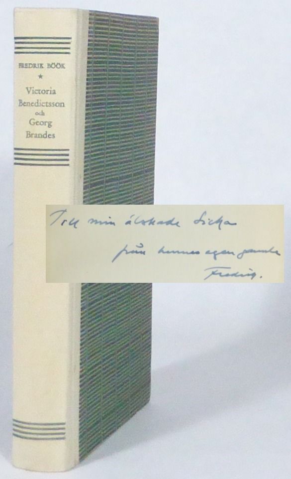Stockholm; Bonniers, 1949. Sjätte-tionde tusendet. 22x15,5 cm. 309, (1) s. + 6 planschblad + handskriftsfaksimil. Förlagets halvlinneband med infärgat övre snitt, utan skyddsomslaget. Ryggändar och pärmhörn aningen tilltryckta. Några små fläckar på främre pärmen. Bra ex. Skildringen som till största delen bygger på Benedictssons dagböcker gav upphov till en upprörd debatt där särskilt danska litteraturhistoriker trädde fram som försvarare för Brandes och hans roll i Benedictssons öde. (cf. Svante Nordin, Fredrik Böök. En levnadsteckning, s. 369-374). Dedikation: ""Till min älskade Sicka från hennes egen gamle Fredrik."" Mottagare var Gun Böök-Hederström (1917-2019), dotter till Fredrik Böök. Arvidsson, Fredrik Bööks bibliografi 1898-1967, 3044.