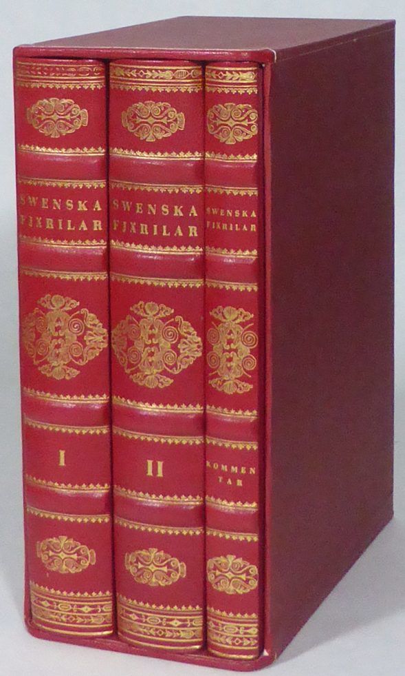 Stockholm; Renée Coeckelberghs editioner, 1989. 23x18 cm. (1, 1 blank) s. + 148 planscher + kolofon & (1, 1 blank) s. + 144 planscher & 127, (1) s. Tre röda originalskinnband (Grafiche Milani) med förgylld ryggdekor, upphöjda bind och övre guldsnitt, förvarade i förlagets röda pappkassett. Mycket fin uppsättning av faksimilutgåvan. Nr 718 av upplagans 4000 exemplar.