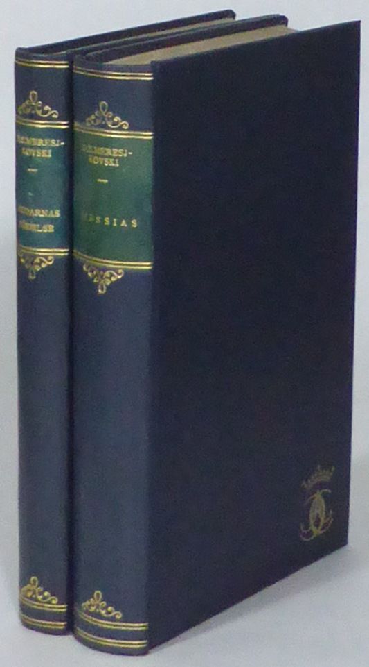 Stockholm; Bonniers, 1928. Originalets titlar: Rozdenie bogov ili Tutanchamon v Grecii & Messija (1925 & 1928). 19x12,5 cm. 232, (1, 1 blank) & 375, (1 blank) s. Två mörkblå klotband (R. Numans Bokbinderi) med ryggetikett i grönt skinn, marmorerade snitt och försättsblad. Samtliga omslag och ryggremsor medbundna. Förgyllt monogram med bokstäverna A och C samt med friherrlig krona på främre pärm, troligen för Anders Cederström (1896-1973). Svaga skrapmärken på ryggetiketterna. Båda ryggremsor med en liten stjärnformad bokhandelsstämpel. Fina ex. Första svenska utgåvan för båda. Merezkovskij (1865-1941) inledde sin författarbana som symbolistpoet och fortsatte med historiska romaner samt religionsfilosofiska essäer och romaner som de båda här erbjudna, där han i romanform undersöker bl. a. Europas och Rysslands förflutna samt diskuterar kontinenternas och kristendomens framtid. Åkerström, Bibliografi över rysk skönlitteratur översatt till svenska s. 603.