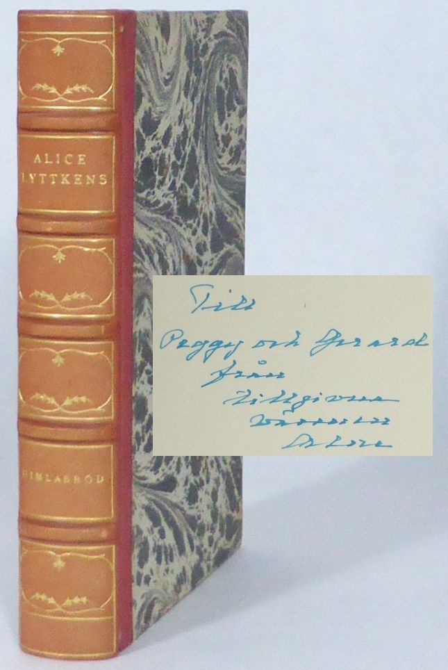 Stockholm; Bonniers, 1953. Originalupplaga. 22,5x16 cm. 373, (2, 1 blank) s. Rött halvfranskt band (Bonniers bokbinderi) med fem upphöjda bind, förgylld ryggdekor, övre guldsnitt och marmorerade pärmpapper. Omslaget medbundet. Omslag av Gunnar Brusewitz. Ryggen lätt blekt. Fint exemplar av den första romanen av fem om Hedda Skoot. Dedikation till förläggarna Gerard och Peggy Bonnier: ""Till Peggy och Gerard från tillgivna vännen Alice"".