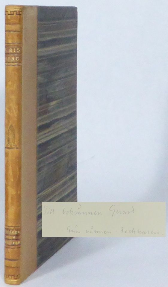 Stockholm; Saxon & Lindströms förlag, 1937. Originalupplaga. 24x16,5 cm. 62 s. Ljusbrunt halvfranskt band (Bonniers Bokbinderi) med förgylld ryggtitel samt dekor i svart, övre guldsnitt och dekorerade pärmpapper. Omslaget medbundet. Ryggen aningen nött. Blekt ruta överst på båda pärmar. Fint exemplar av Risbergs diktsamling med hellenistiska motiv. Boken trycktes i 500 exemplar, varav 100 numrerade som innehåller två extra teckningar. Detta är nr 16. Dedikation från Yngve Berg till förfäggaren Gerard Bonnier: ""Till bokvännen Gerard från vännen -- tecknaren"".