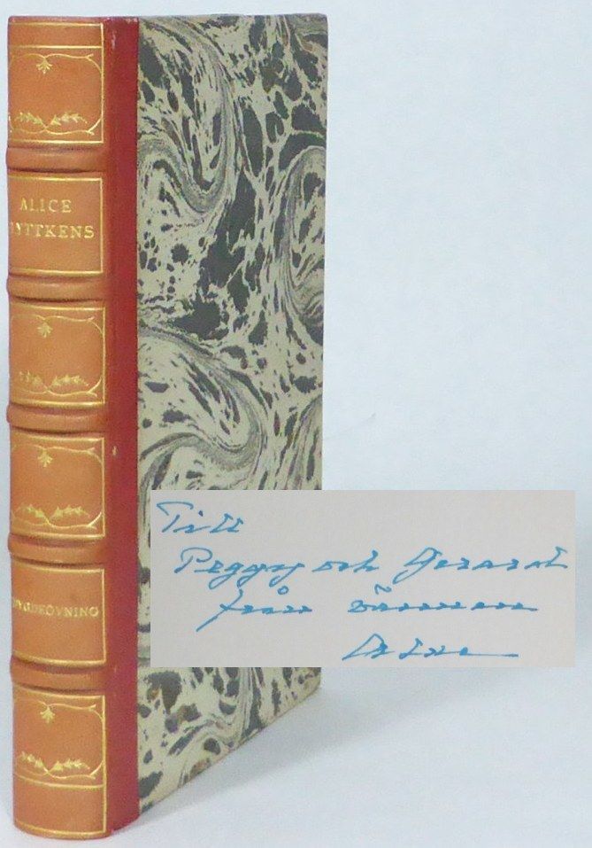 Stockholm; Bonniers, 1954. Originalupplaga. 22,5x16 cm. 319, (2, 1 blank) s. Rött halvfranskt band (Bonniers bokbinderi) med fem upphöjda bind, förgylld ryggdekor, övre guldsnitt och marmorerade pärmpapper. Omslaget medbundet. Omslag av Gunnar Brusewitz. Ryggen lätt blekt. C:a halva inlagan med svagt hörnveck nedtill. Fint exemplar av den andra romanen av fem om Hedda Skoot. Dedikation till förläggarna Gerard och Peggy Bonnier: ""Till Peggy och Gerard från vännen Alice"".