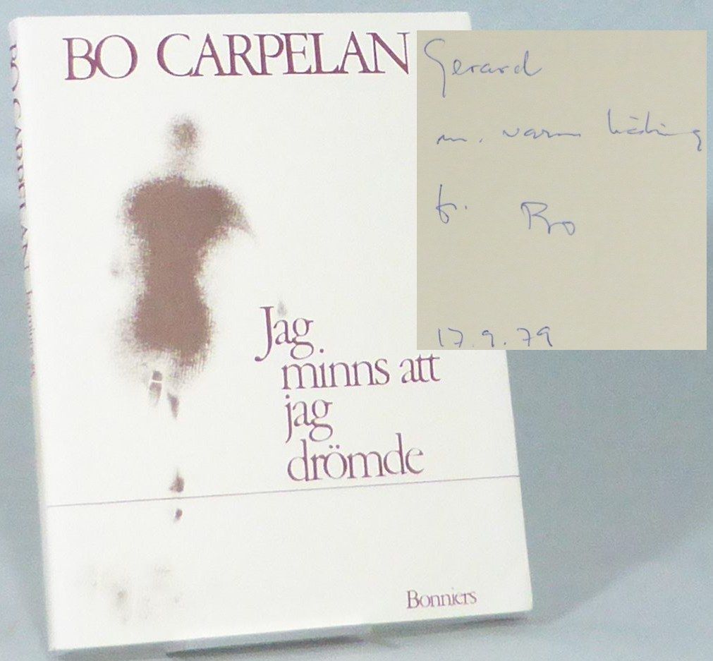 Stockholm; Bonniers, 1979. Originalupplaga. 20x15,5 cm. 147, (2, 1 blank) s. Häftad med blankt omslag, tryckt skyddsomslag. Några obetydliga fläckar på skyddsomslaget. Fint ex. Med dedikation till förläggaren Gerard Bonnier: ""Gerard m. varm hälsning fr. Bo / 17.9.79"".